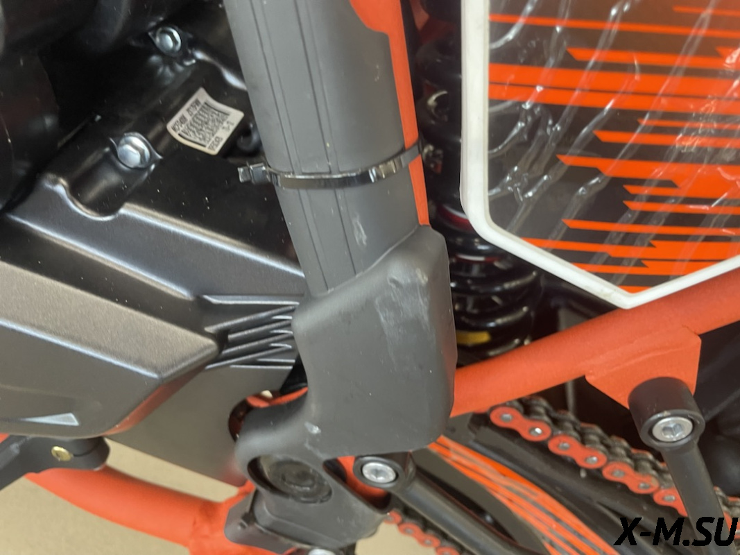 Рама изготовлена с упором на надежность и долгий срок службы. Все узлы тщательно проварены, есть дополнительные усиления. На раму установлен пластиковый каркас, который защищает мотоботы и раму. Алюминиевый маятник KTM для сбалансированного веса и большей прочности.