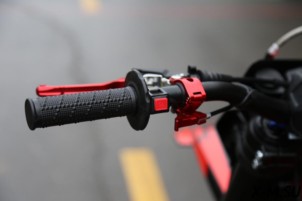 Рукоятка акселератора с коротким ходом: Короткоходная рукоятка акселератора также позволяет самостоятельно регулировать положение троса открытия заслонки карбюратора, чтобы гонщик мог выбрать необходимое для ускорения усилие щетки, наиболее оптимальное для его стиля вождения.
